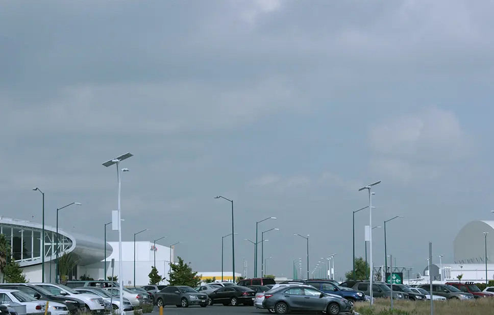 “Se logra una iluminación eficiente y segura en el estacionamiento del Aeropuerto de Querétaro, aprovechando al máximo la energía solar para cuidar el entorno y brindar mayor seguridad a la comunidad.”