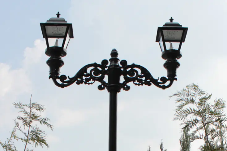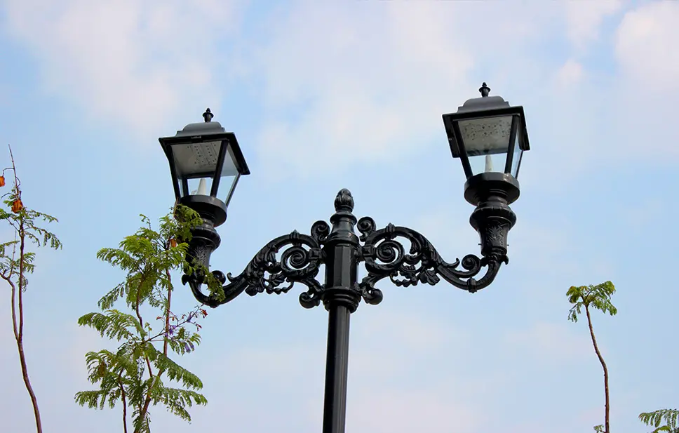 - Los luminarios fueron instaladas en postes rectos con base Holandesa y brazos modelo Imperial, fabricados en fundición de aluminio y con pintura electrostática en color negro, asegurando durabilidad y armonía con el estilo colonial del recinto.
