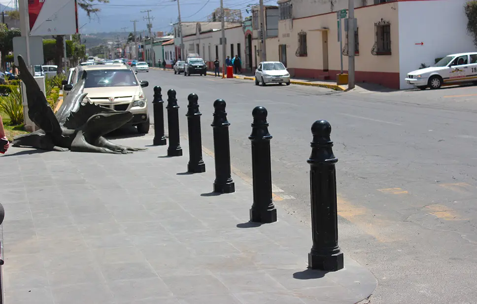 - Bolardos Coyoacán Petit y Tonanitla con cadena, delimitando áreas peatonales y protegiendo espacios sensibles, mejorando la seguridad vial y peatonal.
