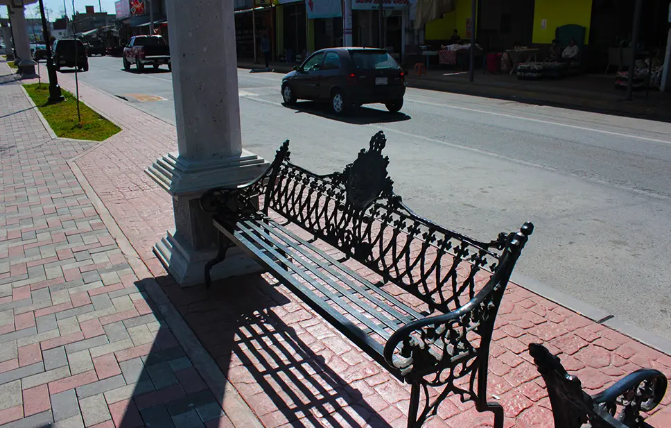 - Más de 35 bancas Porfirianas, fabricadas en fundición de aluminio con asientos de solera de acero galvanizado, personalizadas con el logotipo del municipio, ubicadas estratégicamente en paradas de autobús y zonas de descanso.